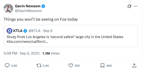 2. California Governor Gavin Newsom shares KTLA coverage of personally authored SmartAsset study, yielding 1.5 million views and 39k likes.